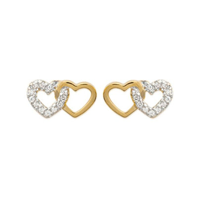 Nouveau Boucles d'oreilles plaqué or 750 bicolore et oxyde de zirconium double coeurs entrelacés