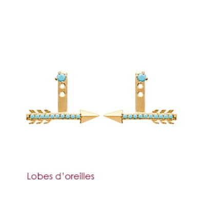Boucles lobes d'oreilles flèches Plaqué Or et pierre bleu turquoise 18mm x 12mm