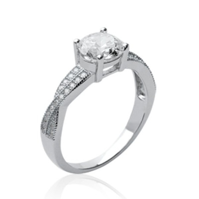 Bague solitaire entrelacée femme - argent massif rhodié - zircon rond 4 griffes