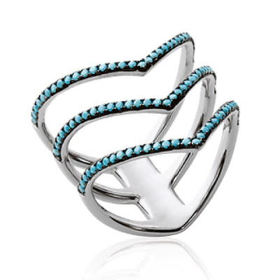 Bague trois anneaux coeur femme - argent 925 massif rhodié - pierres turquoise