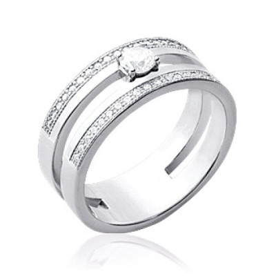 Bague double anneau femme - argent massif 925 rhodié - strass et zirconium